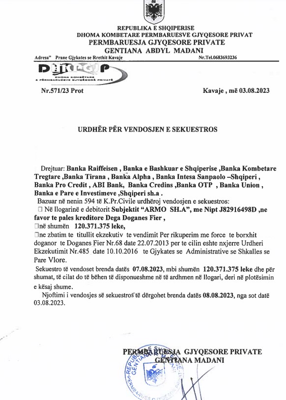 Këto ditë Dogana e Fierit ka dorëzuar nëpërmjet përmbaruesit një kërkesë për sekuestro në QKB ndaj subjektit ARMO.