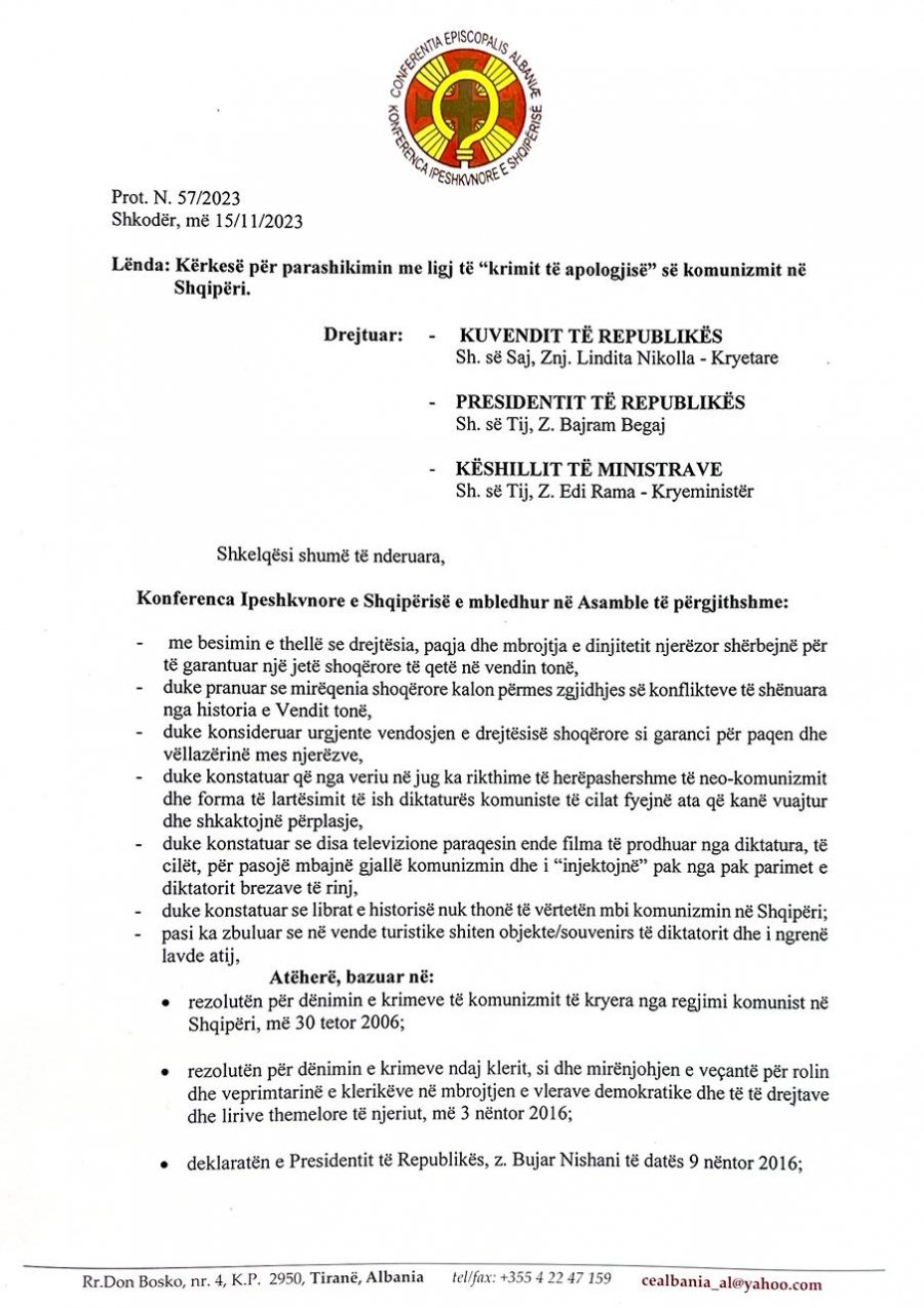 Ndërkohë pak ditë më parë dënimin e krimeve të komunizmit me ligj e kërkoi edhe shoqata e ish të përndjekurve politik. Kjo është hera e parë që Kisha Katolike shqiptare i drejtohet me një kërkesë zyrtare Presidentit për dënimin me ligj të krimeve të komunizmit dhe simboleve të tyre.