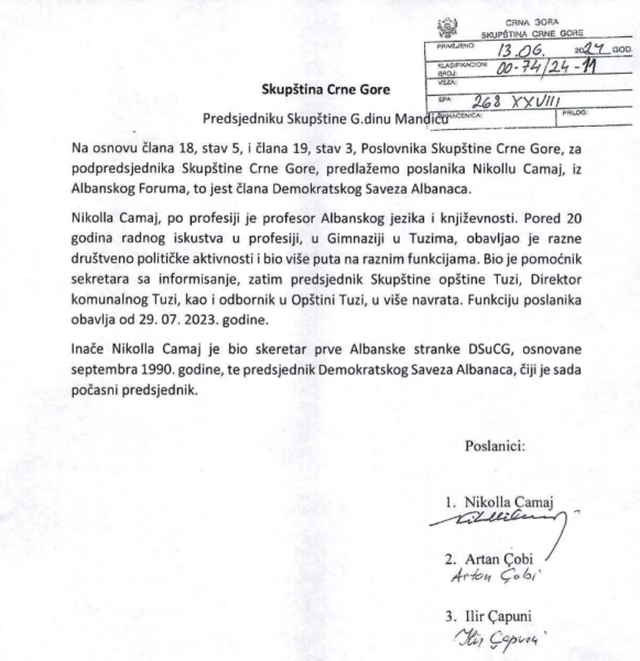 Nikollë Camajn propozohet për nënkryetar të Kuvendit. Bashkë me deputetët Artan Çobi dhe Ilir Çapuni i kanë dërguar një letër kryetarit të Kuvendit të Malit të Zi, Andrija Mandiç në të cilën shprehin propozimin.