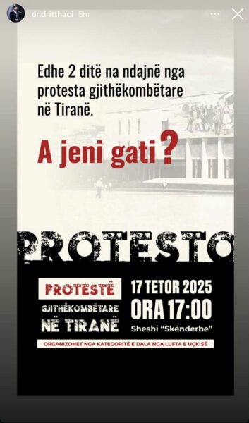 Endriti Thaçi, djali i ish-presidentit të Kosovës, Hashim Thaçi, ka shpërndarë në rrjetet sociale thirrjen për pjesëmarrje në protestë, duke e shoqëruar me mesazhin “A jeni gati?”. Me këtë postim në Instagram, ai ka ftuar qytetarët nga të gjitha trojet shqiptare t’i bashkohen tubimit që kërkon drejtësi për ish-udhëheqësit e UÇK-së të ndodhur në paraburgim në Hagë.