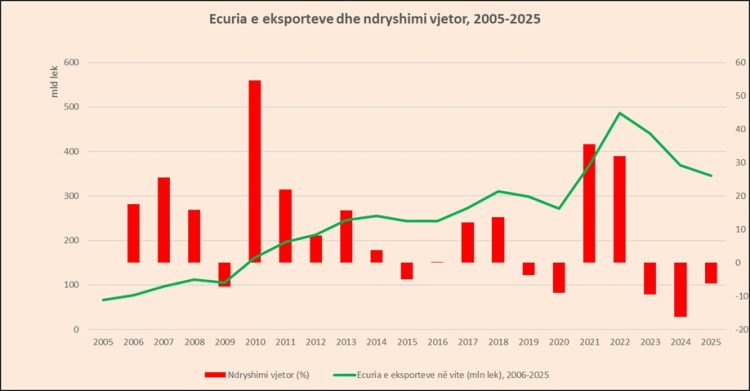 Sipas INSTAT, në vitin 2025 eksportet ranë me 6.1 për qind, duke arritur në 346 miliardë lekë. Një vit më parë rënia ishte edhe më e fortë, ndërsa edhe 2023 shënoi tkurrje. Në 10 vitet e fundit, eksportet kanë rënë në shumicën e viteve dhe janë rritur vetëm përkohësisht pas pandemisë.
