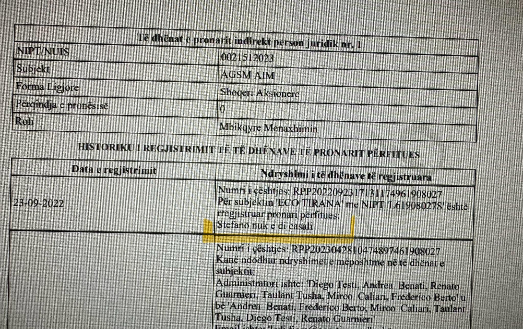Gazetari Klodian Tomorri ka publikuar regjistrin zyrtar të pronarëve të kompanisë Eco Tirana, e cila shërben për përpunimin e mbetjeve në Tiranë, ku nuk ka kaluar po u ironizuar emri i pronarit përfitues. Siç duket edhe në foton e publikuar nga Tomorri është emri i pronarit përfitues është “Stefano nuk e di Casali”.
