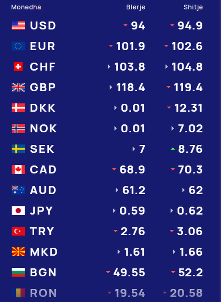 Monedha europiane, euro blihet me 101.9 lekë dhe shitet 102.6 lekë. Dollari amerikan blihet me 94 lekë dhe shitet me 94.9 lekë, ndërsa franga zviceriane do të blihet me 103.8 lekë dhe shitet me 104.8 lekë. Ndërkohë paundi britanik blihet me 118.4 lekë dhe shitet me 119.4 lekë.
