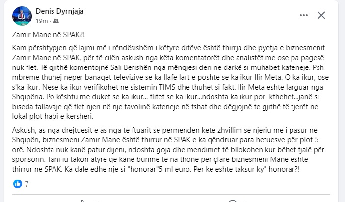 “Askush, as nga drejtuesit e as nga te ftuarit se përmendën këtë zhvillim se njeriu më i pasur në Shqipëri, biznesmeni Zamir Mane është thirrur në SPAK e ka qëndruar para hetuesve për plot 5 orë. Ndoshta nuk kanë patur dijeni, ndoshta goja dhe mendimet të bllokohen kur bëhet fjalë për sponsorin. Tani iu takon atyre që kanë burime të na thonë për çfarë biznesmeni Mane është thirrur në SPAK. Ka dalë edhe një si “honorar”5 ml euro. Për kë është taksur ky” honorar?!”, shkruan ai në Facebook.