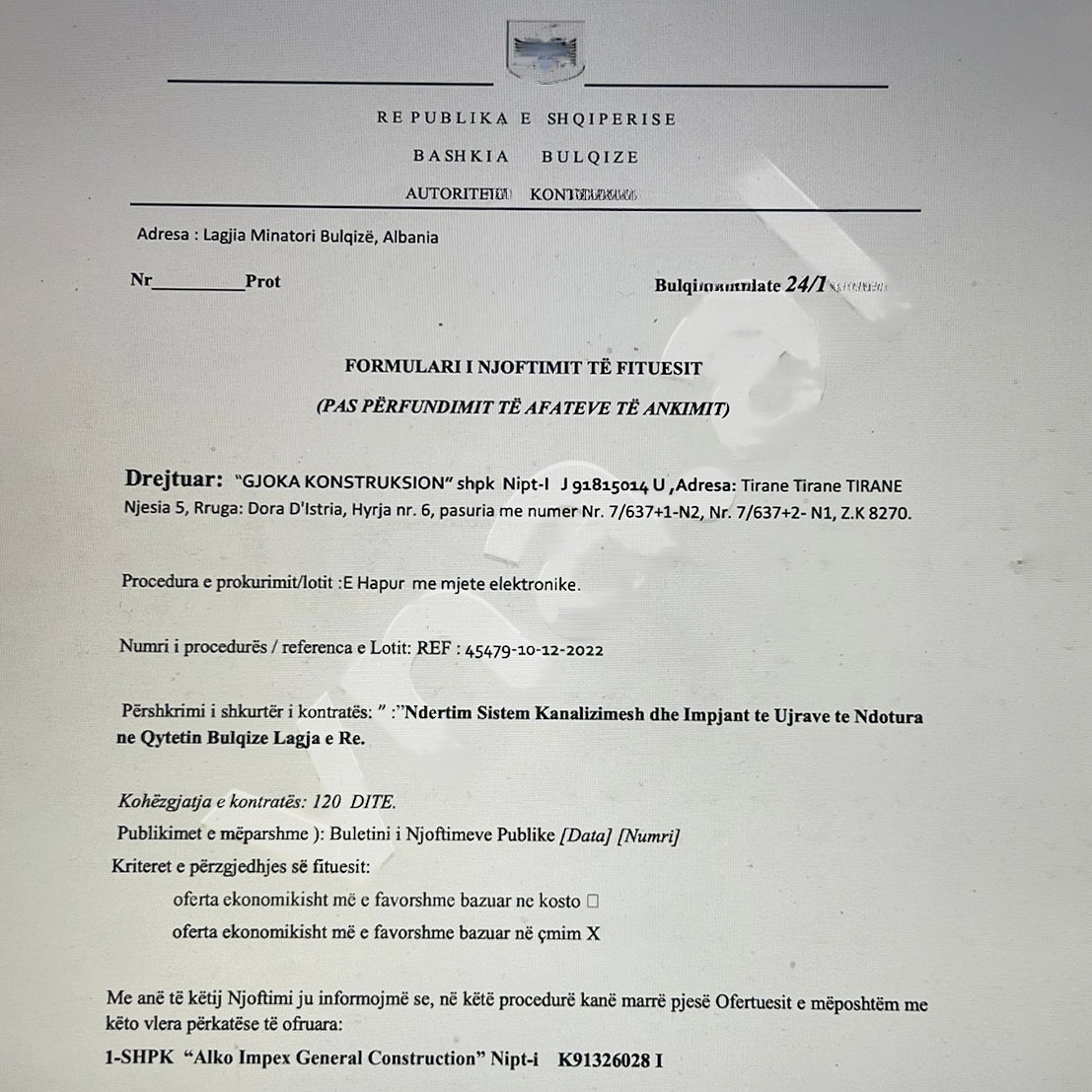 Firma është shpallur fituese e tenderit për “Sistem Kanalizimesh dhe Impiant Trajtimi të Ujrave të Ndotura në Qytetin Bulqizë Lagjja e Re” në 16 nëntor të vitit 2022, kundrejt një oferte 2.4 milion euro me tvsh.