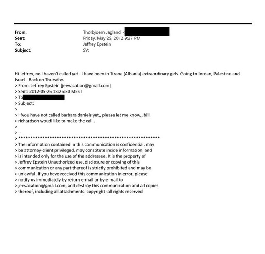 Detaje të reja janë zbuluar pas publikimit të miliona faqeve dokumente nga dosjet hetimore mbi Jeffrey Epstein, të deklasifikuara nga Departamenti Amerikan i Drejtësisë. Mes materialeve të reja del edhe një email i datës 25 maj 2012, i cili tregon se Thorbjørn Jagland, në atë kohë Sekretar i Përgjithshëm i Këshilli i Europës, i kishte dërguar një mesazh Epstein pas një vizite zyrtare në Shqipëri.