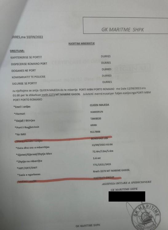 “Ky dokument lëshohet nga dhoma e tregtisë, dogana respektive dhe rafineria ku prodhohet. Në rastin konkret, dokumentat janë lëshuar nga terminali me emrin RAS EL MUNGAR, Benghazi“.