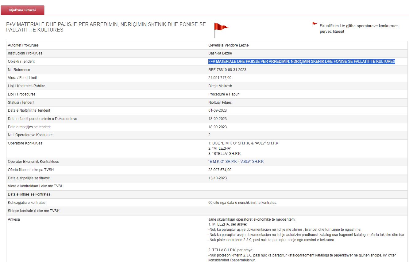 Në dokumentet që Gijotina.com i disponon, zbulohet se janë paraqitur 3 oferta, por njëra në mënyrë fiktive. Kështu kompania “M. LEZHA” rezulton pa ofertë ekonomike, ndërsa firmën STELLA” SH.P.K, Ndreu e ka skualifikuar nga gara që në fazën e parë.