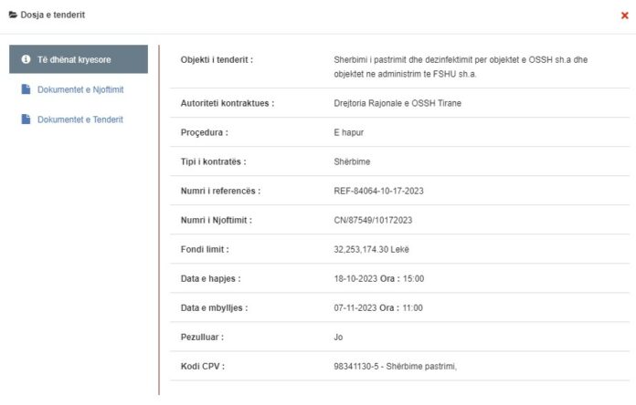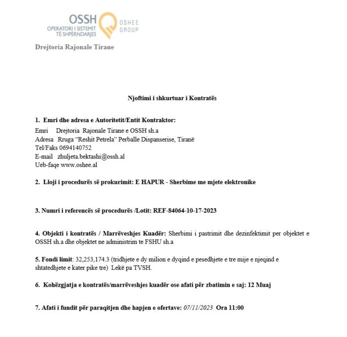 Objekti i kontratës është për “shërbimin e pastrimit dhe dezinfektimit për objektet e OSSH sh.a dhe objektet në administrim të FSHU sh.a. Vlera e prokurimit është 32,253,174.3 Lekë. Kontrata është për një vit. Afati i fundit për paraqitjen dhe hapjen e ofertave: 07/11/2023. Shërbimet e dezinfektimit janë të rëndësishme për sigurinë dhe shëndetin publik.
