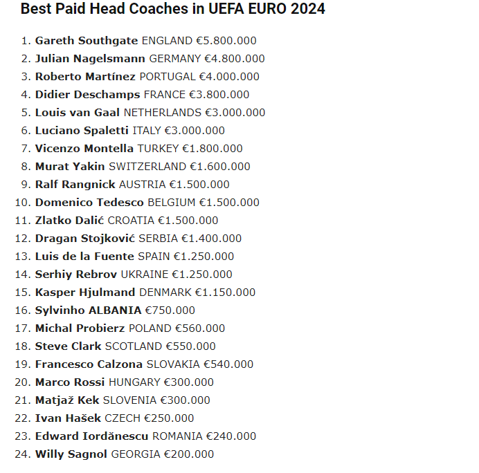 Me Kampionatin Europian “Gjermani 2024” që po afrohet, janë bërë publike pagat e trajnerëve të 24 skuadrave pjesëmarrëse. Sipas “Finance Football”, lista tregon trajnerët nga më i paguari deri tek më pak i paguari.